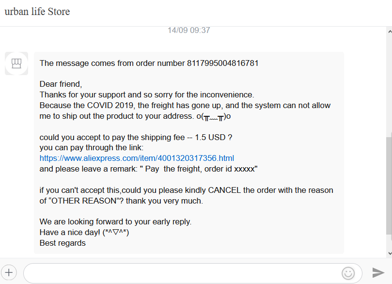 1. Fizetsz 1,5 $-t még szállításra. Ha igen katt a linkre és ott még írd be a megjegyzés részhez hogy: "Pay the freight, order id 811...(a rendelés számod)" Ez annyit jelent hogy kifizeted a plusz szállítási díjat erre a rendelésre.2. Visszavonod a rendelést. Akkor pedig azt kéri hogy lehetőségként válaszd az "egyéb okot" (other reason) amikor kérdezi hogy miért nem kéred mégse.