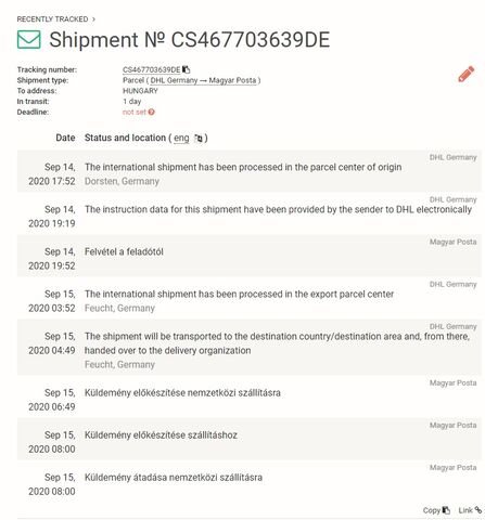 Maradjunk annyiban hogy ez nem spanyolból jött, mert onnan nem német postai azonosítóval küldik, ES a vége, de a GLS szokott szállítani. Ez nem is DHL Express futár, hanem a normál német posta itt magyar postai kézbesítéssel.