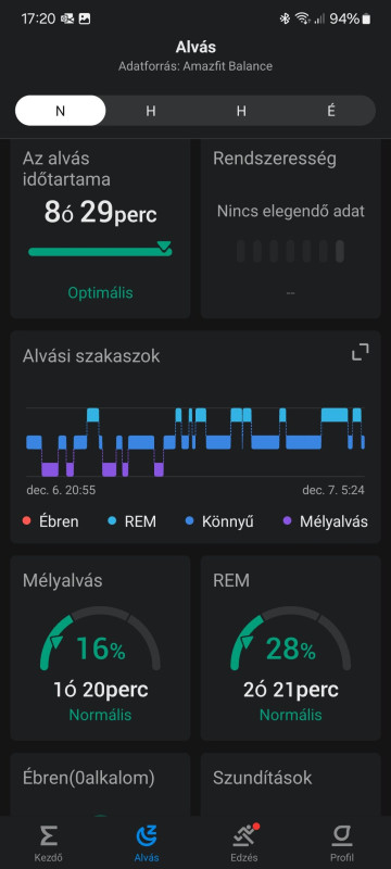 Engedd el, az alváskövetés ezekben saccra megy, ebben egészen biztos vagyok. Amikor tavaly novemberben megvettem a GTR3-at, 1 hétig párhuzamosan aludtam vele és a Fitbit Charge 3-assal, amit addig viseltem. KÖZE NINCS a valósághoz a GTR-nek, és azóta sem javították. Az egyetlen érdemi adat az éjszakai pulzus, a többi egy vicc. Szerintem a legnagyobb baj az, hogy nincs benne folyamatos pulzusmérés, naná, hogy nem rögzíti a rövid megébredéseket (a példád szerint a hosszabbakat se). Volt, hogy a szekrényen hagytam éjjel, az se tűnt fel neki, rendesen rajzolta a görbéket. Egyébként amikor indítja az ember a ZEPP-et, és szinkronizál egyet a telefonnal, akkor is látszik, hogy változik az addig megjelenített alvás elemzés. Kérdés, hogy amúgy addig mégis milyen adatokkal dolgozott, mit jelenített meg az applikáció, amikor a telefon repülőmódban volt? Vicc az egész. Amiben jó, az az, hogy az értesítésekben atom megbízható, és az üzemidő parádés, illetve a külcsín és a kijelző is parádés. Éééééés, ennyi.