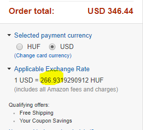 USA címre szeretnék rendelni magyar bankkártyával. Ki lehet választani, hogy HUF-ban vagy USD-ben fizessek-re. Ha az USD-t választom, akkor ugye nem az a 267 forintos dollár árfolyam van, hanem az én bankom árfolyama?