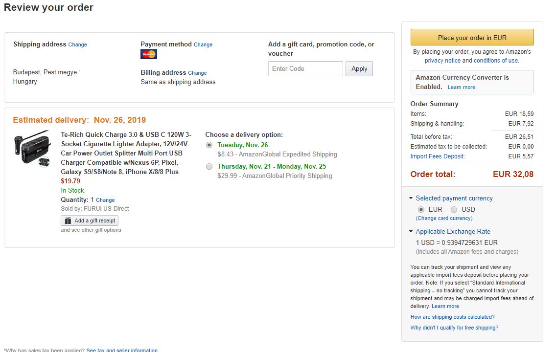 The item is shipped from USA, fulfilled by amazon. Szóval USA.A képen látható a rendelés előtti kép az összegekről.