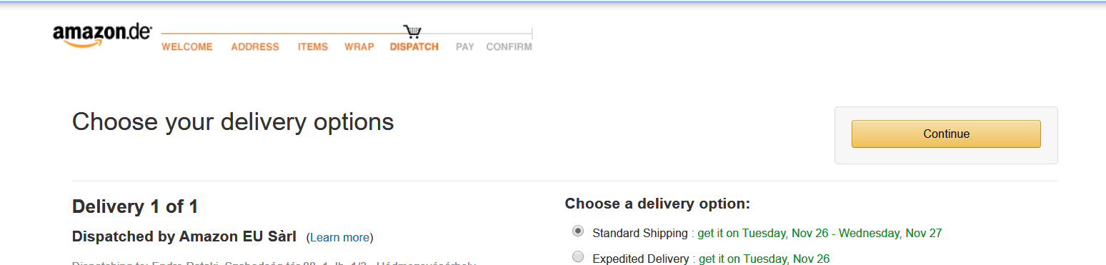 A következő lépésnél, miután jóváhagytam a regisztrációkor megadott lakcímemet, mint szállítási címet, valami "EU Sárl"-os akármi