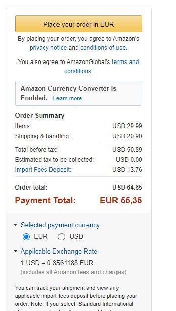 Elméletileg usd ben fizetek és a + 36usd ben benne van a szállítás és az import fees deposit ( tehát gondolom nem lesz gond eur val meg vámmal áfával akármivel )Euros Amazonról már jóval drágább. Azért nézem ezt.