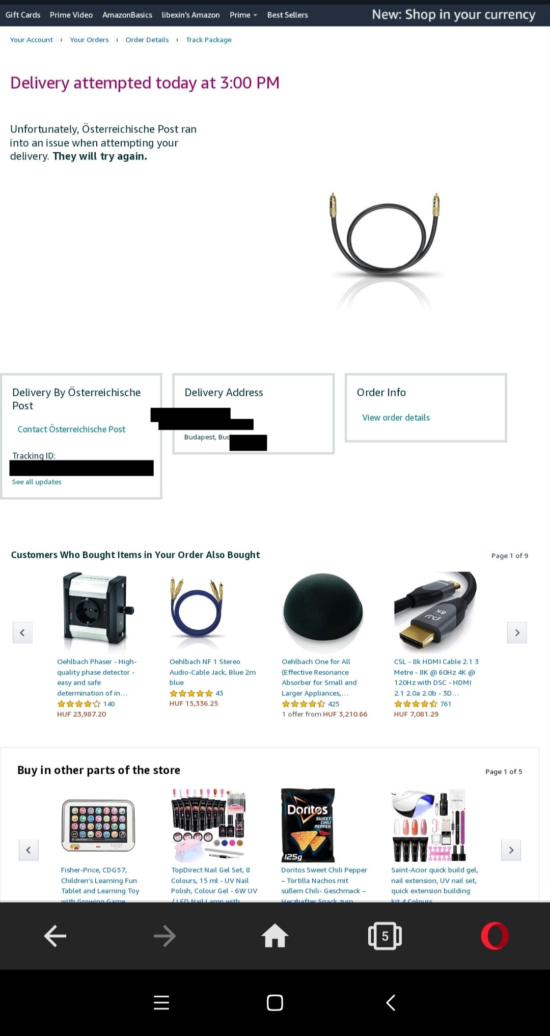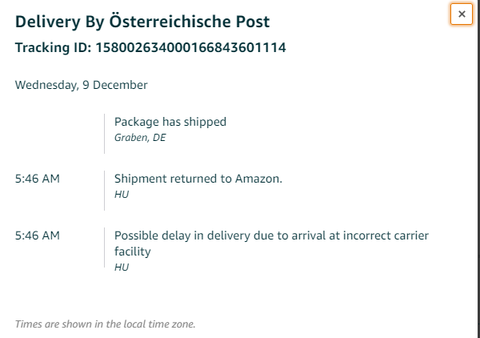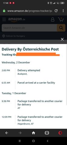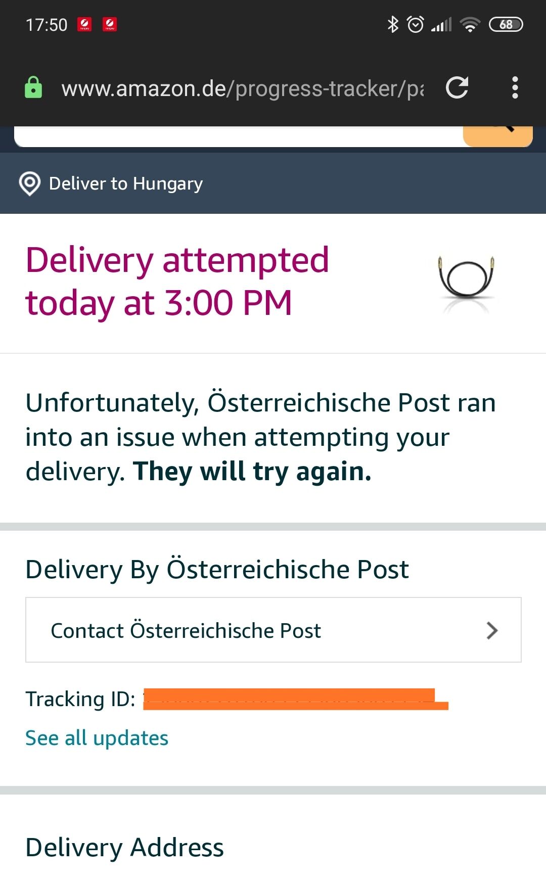 Német amazonról rendeltem egy terméket. Nyomkövetés szerint tegnap Pestre érkezett. Ma kaptam egy üzenetet, hogy az osztrák posta du. 2kor nem tudta kézbesíteni a csomagot.