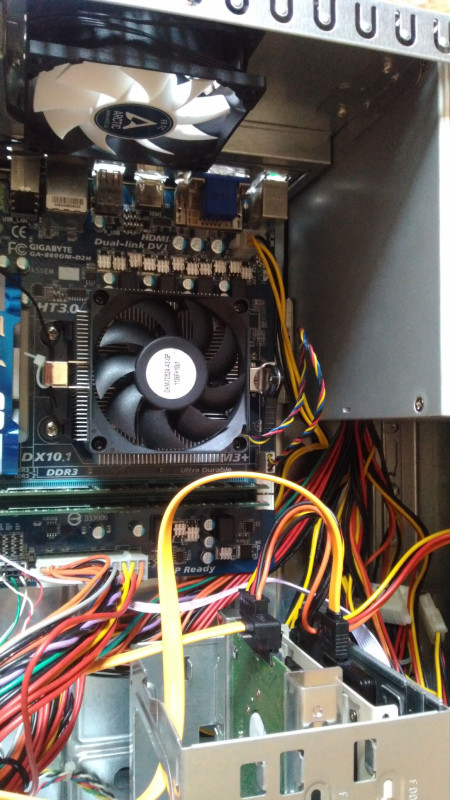 Jelenleg Phenom II X3 720 BE van benne négymagosítva és 3,2 GHz-en járatva, azaz gyakorlatilag Phenom II X4 955 CPU-ként üzemel. Egy kicsit emelni kellett vcore-on, hogy stabil legyen ezzel a beállításal a CPU.VRM-eket hűtendő mosfet-ekre tettem 1-1 mini alubordát ahogyan a lenti képen is látható. Hűtő is top flow, és VRM-ek felé is megy valamennyi levegő.