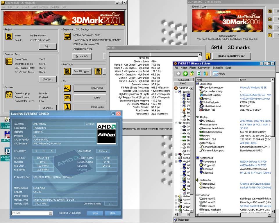 A kindulási alaperedmény, CPU 1GHz+100MHz CL2 SDRAM. Ha feljebb teszem a ramokat CL3- ban is instabil, pedig ezek az SD- k tuti mennek 133/CL3- ban, tehát eddig úgy néz ki DDR- t kell beletenni a def 1400- as CPU órajelhez is