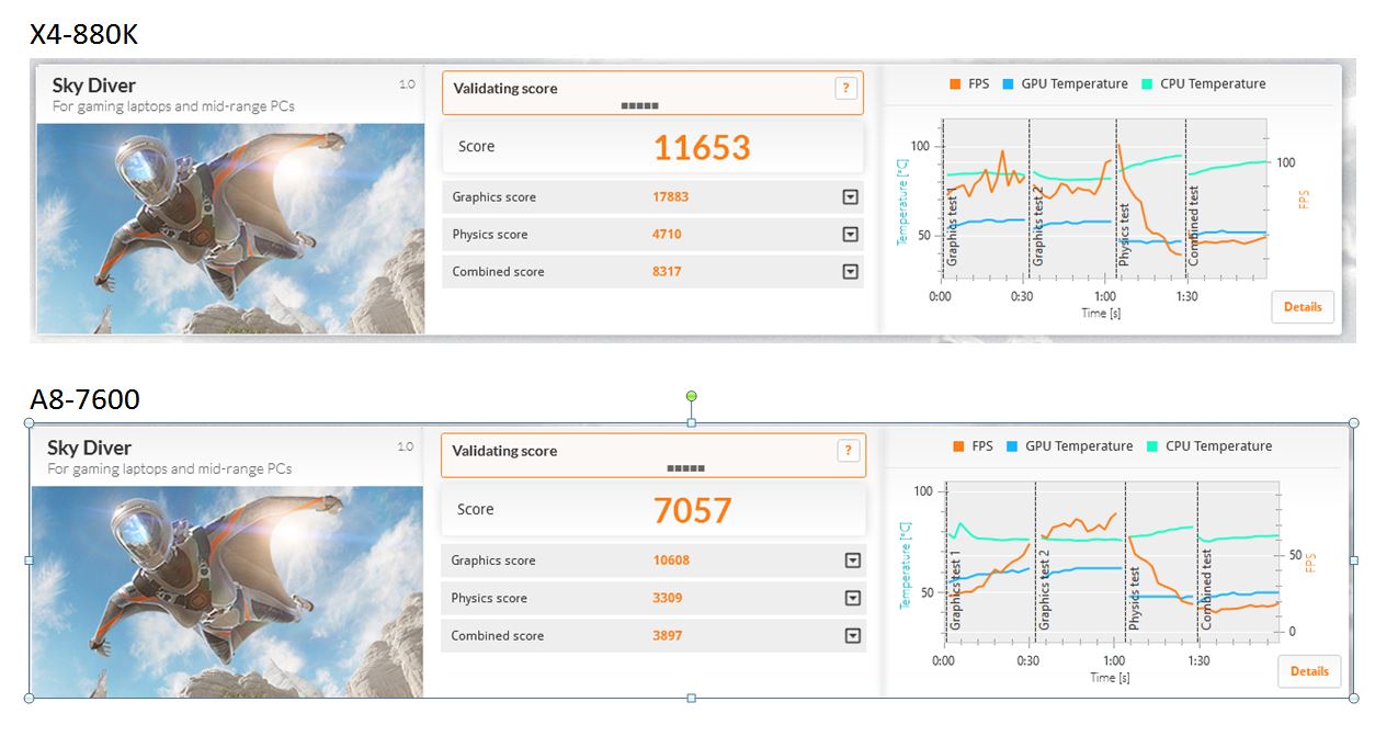 Az A8-7600-os 38-as szorzóval szintén 103 MHz busz sebességen ment (3914MHz).A 880K PassMark eredménye (itt látható a többi hardverelem is):