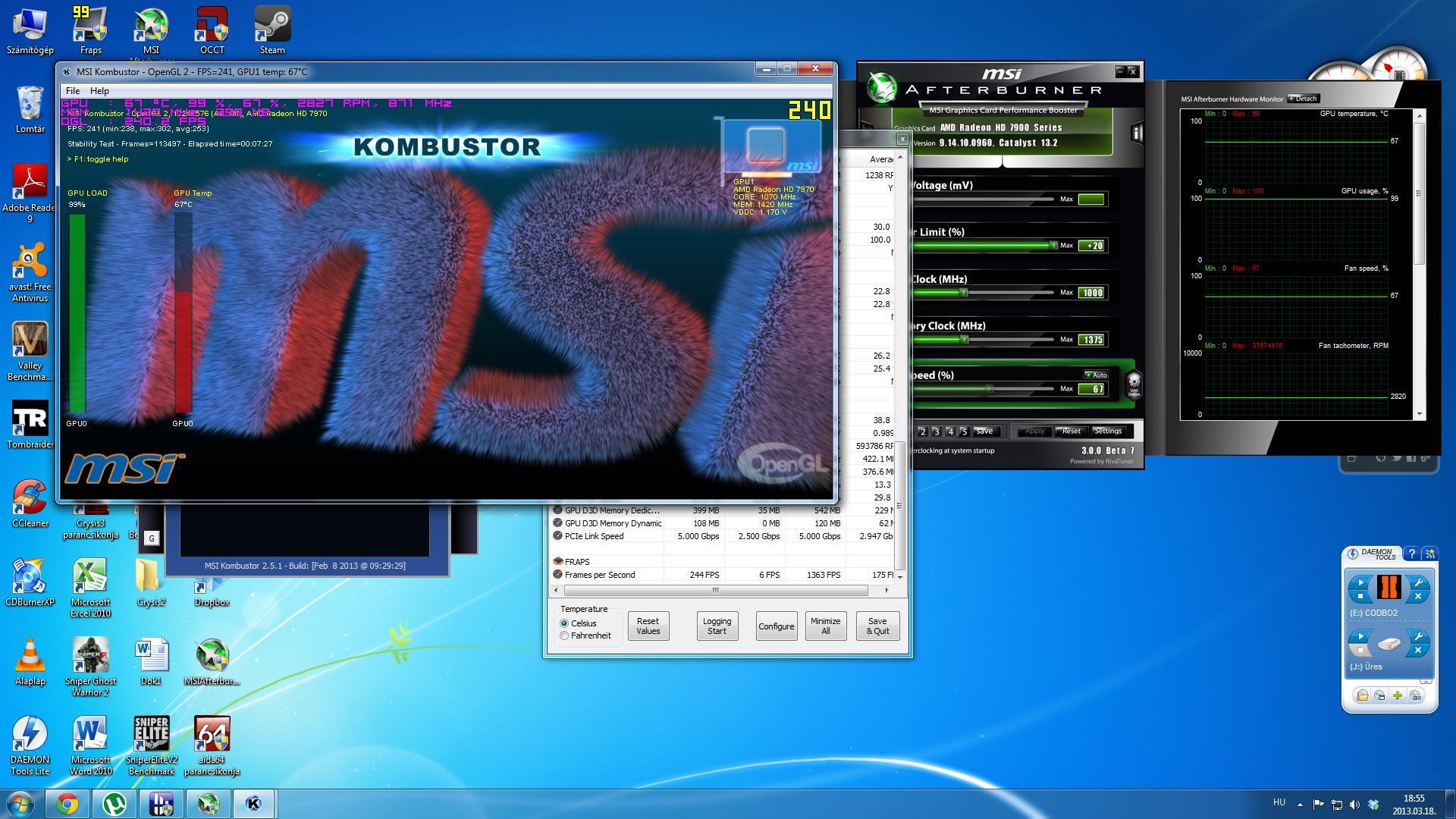 Egyébként a kombustor 1,081 V-on stabil volt, de a 3D-Mark-nak viszont még kellett egy kis fesz mert kifagyott. Ekkor lett az 1,094V a bűvös szám. Még ez fel fog finomodni, ha a játékokat is bevetem. Még kipróbálom a Heaven Benchmarkot is. -