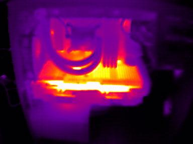 A lényeg, hogy kb. 10 perc valley benchmark (Extreme HD) után így néz ki a kártya, a legpirosabb részeken, és a GPU mögötti részen, is max 50°C körül volt, a GPU (benchmark szerint) 70°C körül mozgott. A képek elég szar minőségűek, de lehet valamit szarul állítottam be a gépen.