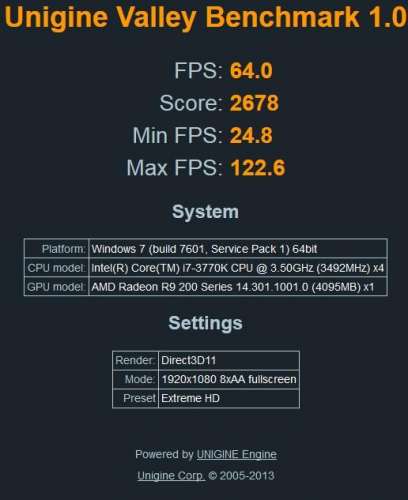1080p extreme HD-ben 2640p tol Valley-ban, és 1401p Heaven-ben mindezt alapon 1030/5300 órajelen.