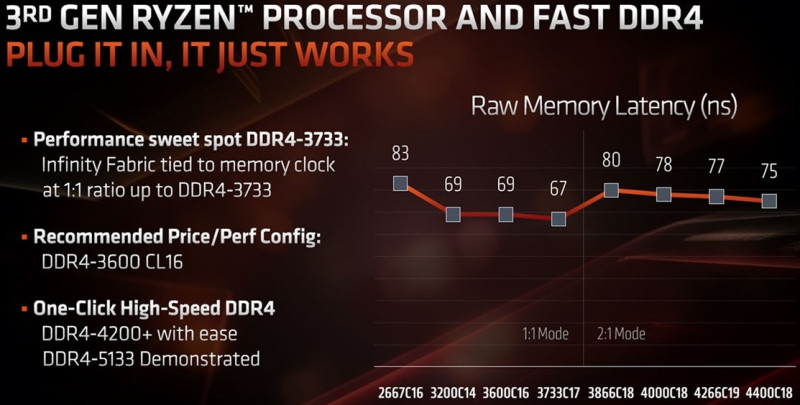 Tulajdonképpen az Infinity fabric DDR4 3600 MHz (1800) -ig megy szinkronban a memóriával. E fölött már felezés van - így a 3733 MHz -nél is már. Ugyanakkor AMD szerint a DDR4 3733 MHz (1866) az ideális ZEN2 esetében a késleltetések szempontjából. Amennyiben szeretnénk ekkor is 1:1 járatni a Infinite fabric órajelét a memóriával (ez lenne az ideális), akkor azt BIOS -ban állítani kell. Ez OC -nak számít az Infinite Fabric szemszögéből.