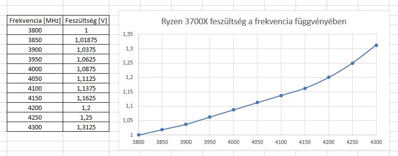 50MHz-es lépésekben haladta, a feszültséget pedig 12,5mV-os lépcsőben állítottam. Kivéve 3850MHz-en mert ott látszott a görbén, hogy a 6,25mV-os lépcsőt kívánja, illetve volt amit újra teszteltem (4,1GHz) mert olyan pukli volt a görbébe amiből látszott, hogy vagy ez az egy mérés hibádzik, vagy az összes többi