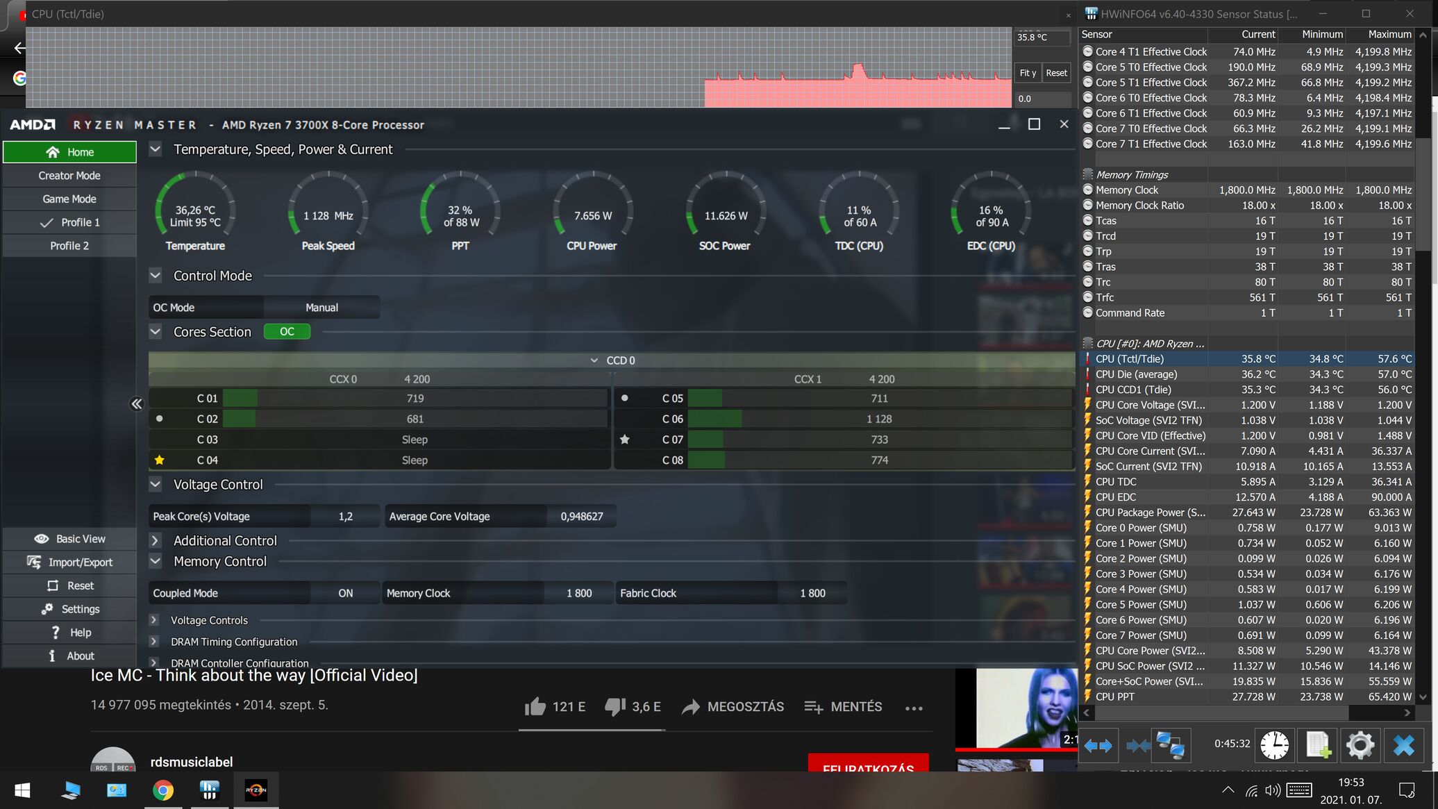 Szóval: gondolom lassan szaporodnak az olyan emberek (hozzám hasonlóan) akik nem érik be 16GB memóriával, a 32 viszont még mindig nagyon drága, pláne ha 3600MHz-est szeretne az ember (és nem CL18-19 meg hasonlóan sz*r késleltetésekkel)...Nekem 2 gépem van (hagyjuk miért), ezek memóriáit dobnám be a közösbe. Nincsenek tuningolva, DRAM Calculatorral mókolva, semmi hasonló (nem is volt cél), csak simán az XMP profiljukkal mennek. Ezen felül (most épp) csak egy Ryzen 3600 van alattuk (az alábbi sebességeket ennek a csonka felépítéséhez mérten nézzétek + full Auto-n van, ezért tér el CPU Clock a két kép közt, de amúgy a proci beállításai és minden más is tök azonosak voltak)