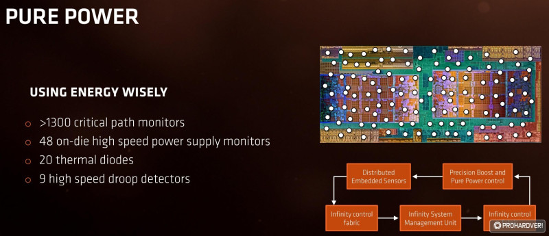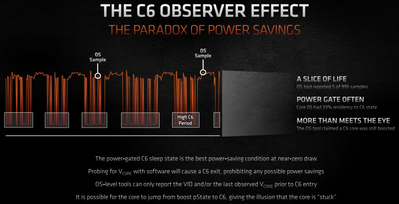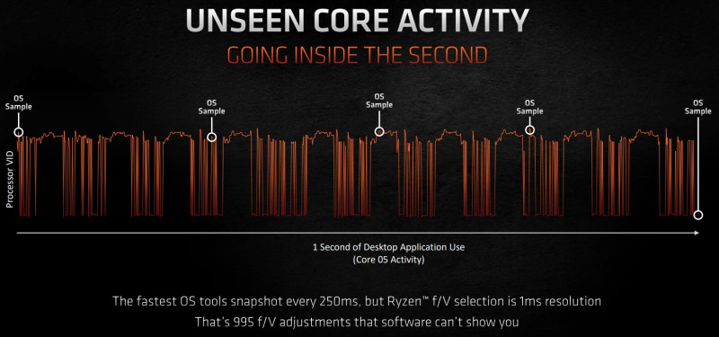 "A probléma az egésszel az, hogy a motorháztető alatti működést nehéz mérni, mert a Ryzenek órajel- és feszültségváltása egyszerűen túl gyors. A legtöbb szoftver fél-egy másodpercenként vesz mintát, amit ki tudnak jelezni a felhasználók felé, így viszont két jelzett adat között nincs meg az temérdek, sok száz órajel- és feszültségváltásra vonatkozó információ, amit a hardver kvázi láthatatlanul elvégzett. Ezen próbál segíteni az AMD azzal, hogy a saját szoftverükben átlagos paraméterekkel dolgoznak, de a működésbeli ugrások igen nagyok is lehetnek, különösen enyhe terhelés mellett."