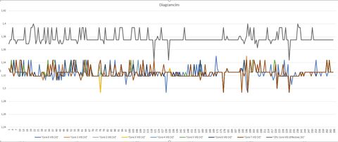 1231mV és 1306mV közötti 75mV tartományban mozog a feszültség és a frekvenciát (4225-4300MHz) is változtatja a rendszer közben, ez teljesen normális így.