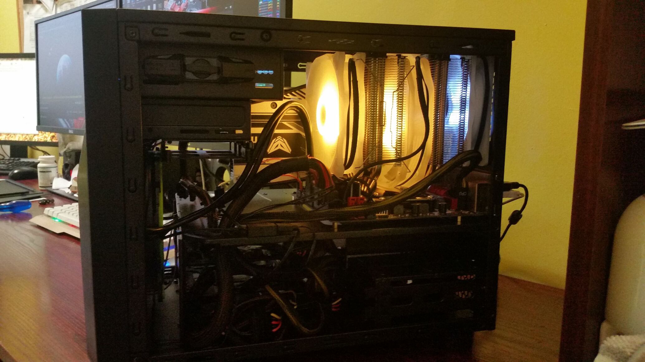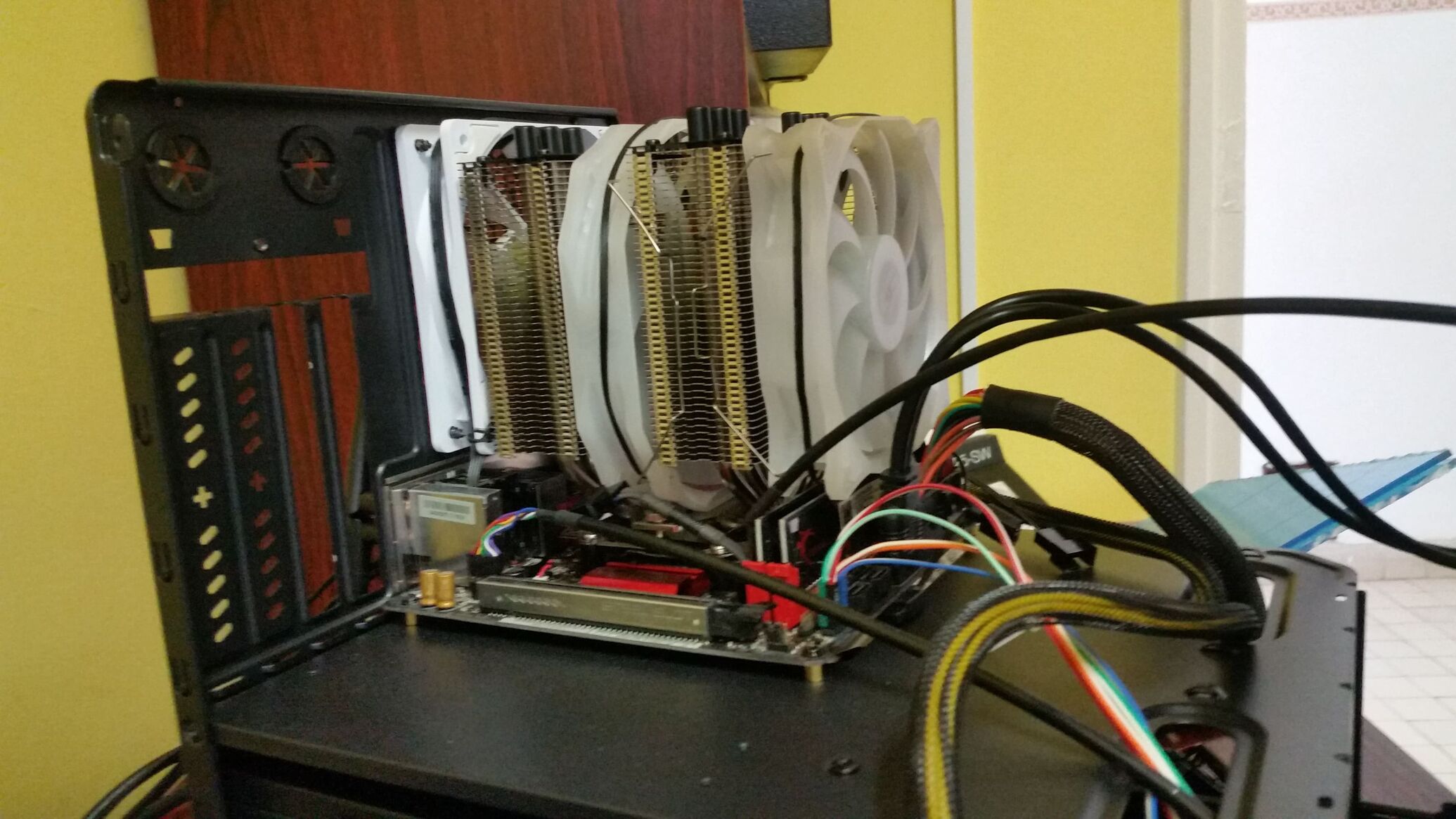 Ismét nyerőnek bizonyult, hogy a stock mérettel bíró Aegis ramokra voksoltam (eredetileg top-flow hűtőhöz mérve vásároltam őket, más méret be sem fért volna alá - fentebb 2 képen jól látszik, hogy pont elférnek a hűtő első 120-as ventije alatt).A reset gombot beáldoztam, arra kötöttem rá a CPU hűtő pico kontrollerét.