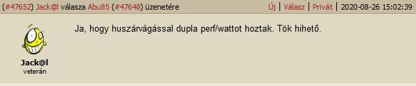 Lehet ezen itt fanyalogni, de pl Jack@l 2 hónapja, még gúnyosan röhögcsélt azon, hogy van olyan hülye aki elhiszi, hogy az AMD tud 300W-ból kétszeres teljesítményt. Aztán most ez a realitás. Nem hugyozta ketté a NV-t, még egyértelműen jobb sem lett, de beérték őket, ez tény. -