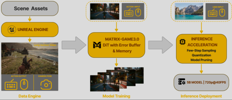 (1) Data Engine — an industrial-scale infinite data engine integrating Unreal Engine synthetic scenes, large-scale automated AAA game collection, and real-world video augmentation to produce high-quality Video-Pose-Action-Prompt quadruplets at scale;