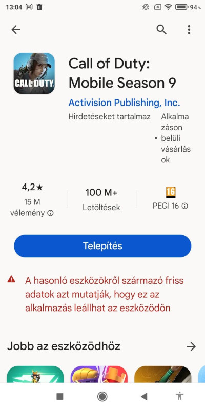 Hááát nem csak az nagyjából minden. Azért időnként jó lenne, ha az ilyen játékoknál a minimum követelményt feldobná a játékosnak mielőtt több száz MB, esetleg több GB adatot letöltene. Na meg a droid verzió is azon max 10-es ha csak nem lett mókolva. Az a teló 5 éves de amikor kiadták is alulról karcolta a közép kategóriát. A játékokhoz meg ugye az nagyon kevés