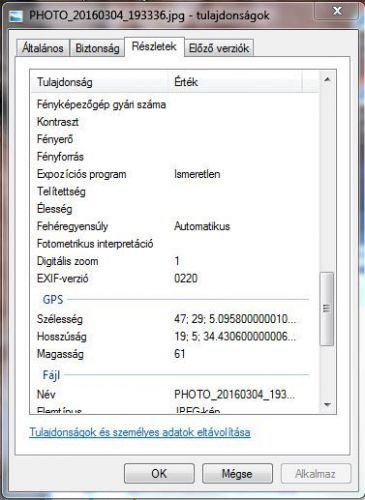Megint lenne egy - valszeg szőkenős - kérdésem: Camera MX, Settingben bepipálva a "Save GPS location" és a képeken-videókon (Tulajdonságok->Részletek Win 7) nem látom a koordinátákat, ahogy más digi kamerán készült képeknél. Hol lelhető fel ez az adat?