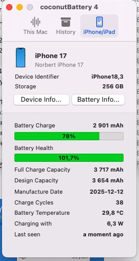 Nekem majd egy évig és 260+ ciklusig 100% volt az iPhone 16, (kb. 104-105%-ról indult, ezzel jót fogtam ki) aztán 2 hónap alatt 95%-ra csökkent. 14 hónapos korában adtam el, ha azt nézzük majdnem havi 1%-ot csökkent átlagosan.