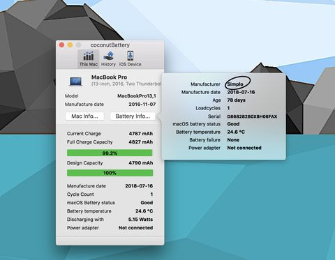 A gyári rendszerjelentés és a coconut battery szerint is ugyanaz az SMP - (SIMPLO) a gyártója az újnak, mint az eredetinek. Az iFixit -től rendeltem. Elvileg 7200 mAh-ás, míg az eredetinél 6700-at írt erre. Ja és persze jó látni, hogy 1 ciklusnál jár.