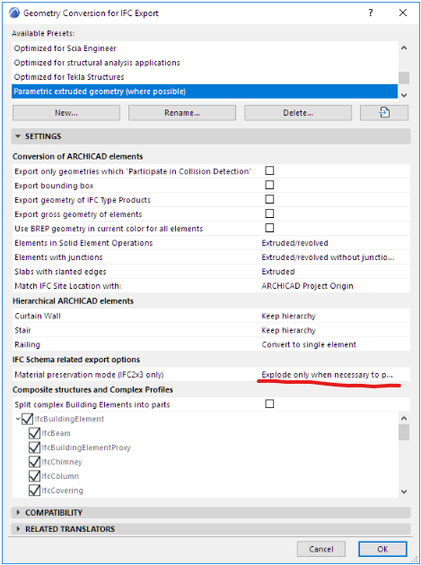 •Explode all elements into parts, preserve materials. All complex elements are exploded into parts, and material preservation is guaranteed.Ezzel úgy érdemes dolgozni, ha az elemeket BREP módban mented ki. Erre van előbeállítás is és akkor több mindent állít, így nem kell egyenként végigmenni rajtuk. Remélem erre gondoltál.