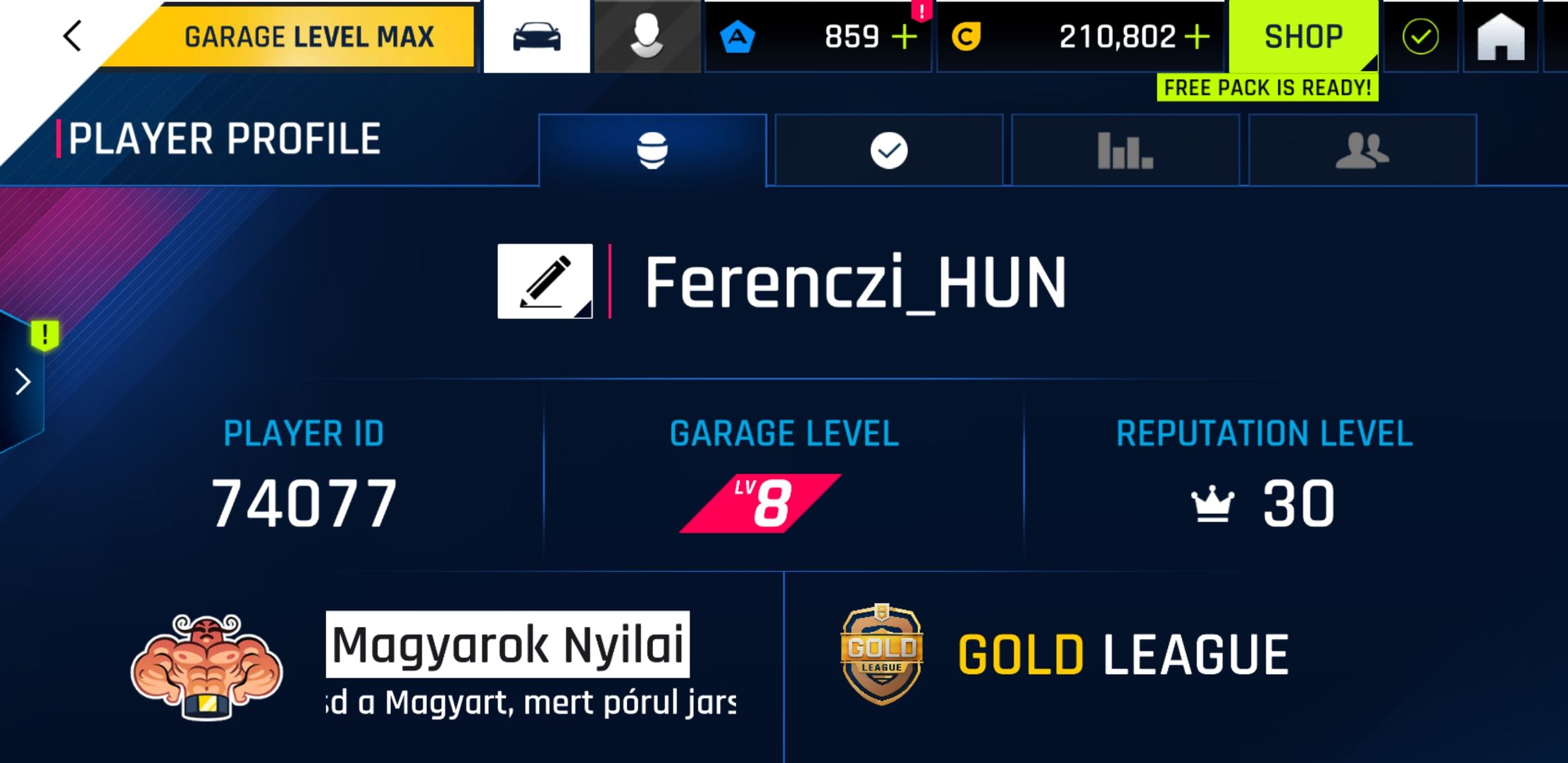 player name, player ID, reputation level, garage level.