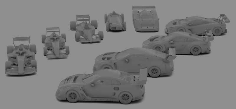 Bal oldalt különböző érák és kategóriák formula autói, Group C Jaguar (tippre az XJR12) jobb oldalt fentről lefelé haladva pedig Mclaren 720S GT3 Evo, Porsche 911 GT3 R, Bentley Continental GT3, Nissan GT-R GT3.