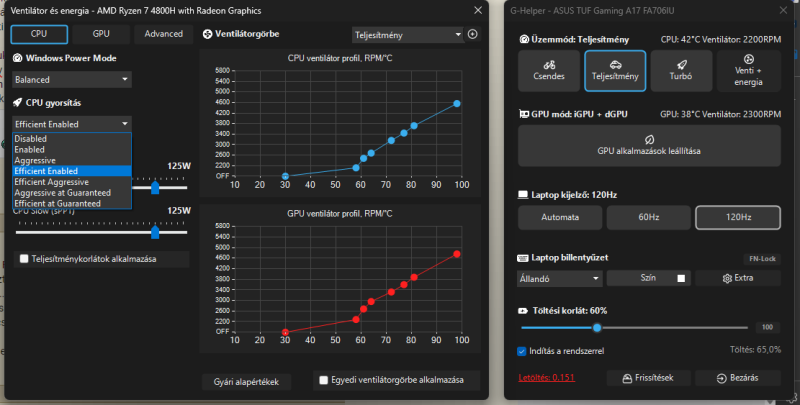 Az amoury crate-ben kb a 2. nap után én is azt csinálom, mikor windowsba böngészek, silent mód, ha meg játszom vagy kell a teljesítmény akkor performance / turbó. és kész, ez így, így kell használni, valszeg így optimális. Más mint a Lenovo.