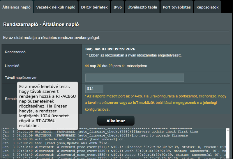 Én sajnos csak elméleti opciókkal tudtam segíteni, de ezekre már nem tudom a választ, többek közt mert pár éve nincs már ASUS routerem, és alkalmazással soha nem is használtam azt, régen se. Azt sem tudom, hogy vajon egy újraindítás során megmarad-e normál esetben a log, vagy mindig törlődik. Ez attól függ ugye, hogy hova írja a router. Ha csak tmpfs-re, akkor minden indítás után új log készül, szóval bár az app-os bejelentkezést így akkor már nem láthatnád, de annyit tudhatsz, hogy dec. 30.-án újraindult a routert.