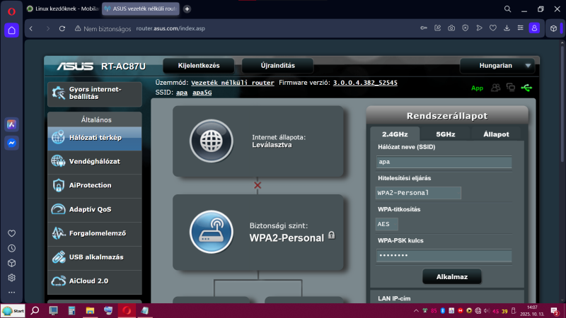 Kattints rá arra a bolygó ikonra és akkor jobboldalt előjön a ki-be kapcsoló gomb. (Már vagy 3 éve van Asus routerem, de még mindig nem tudtam megszokni ezt az felületet. Eleinte konkrétan semmit nem találtam. Mondjuk most se nagyon, össze-vissza kattintgatok mint egy hülye és csak halvány sejtésem van, hogy mintha arrafelé láttam volna. Nem tudom kinek volt a zseniális ölete ez a csicsa.) Nézz be a logba, hátha ír valamit.