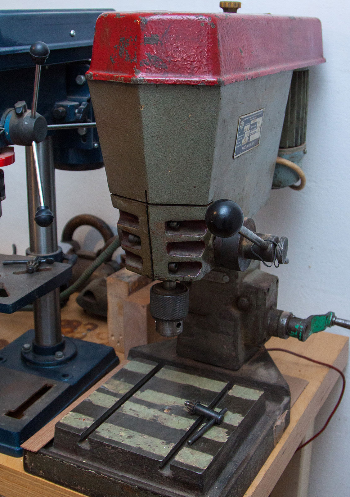 [link] - Látszik ezen a fotón is, ott van az adattáblák után jobbra, a fúrófej leengedő karja kicsit rátakar, de azért látszik. Egy fel le húzható kis műanyag kar.