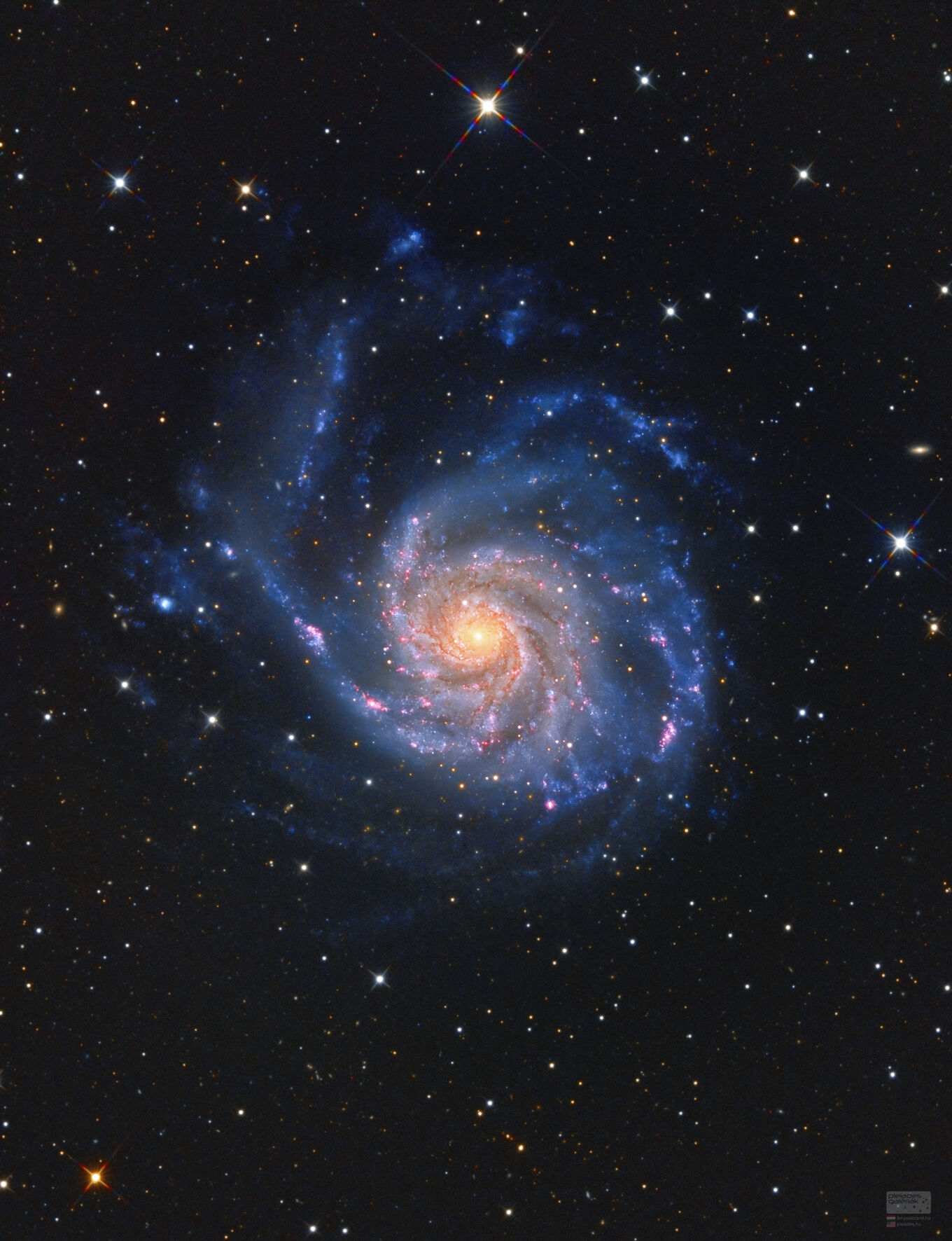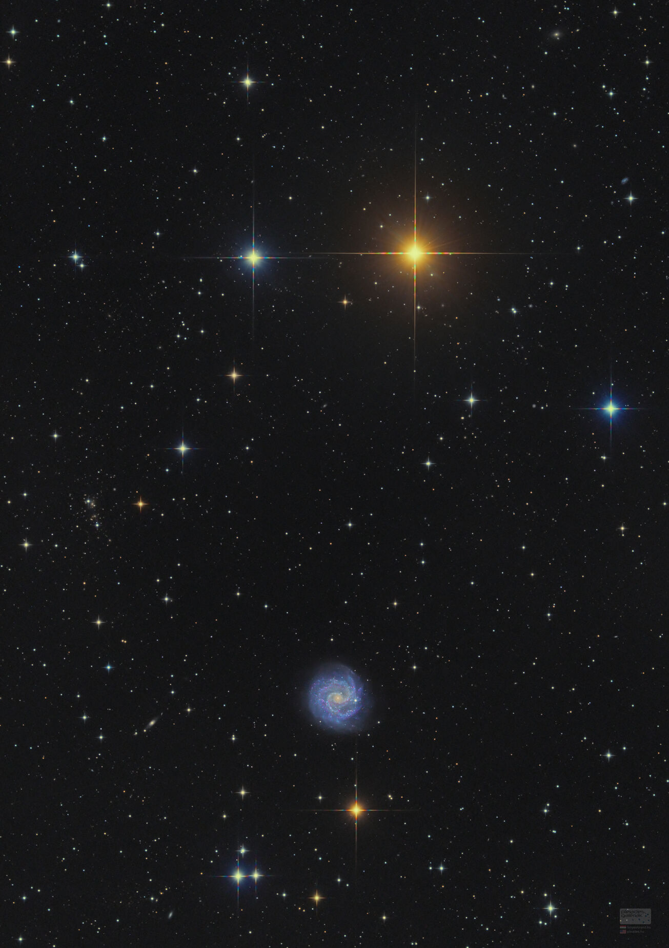 A csillagda átalakítás projekt miatt a kis Orion Optics Newton távcsővel tudok dolgozni tavasszal. Az ezzel járó nagy látószög különösen szép kompozíciókra ad lehetőséget a tavaszi galaxismezők között. A Nagy Medve egy kevéssé látogatott csillaga a ragyogó Tania Australis. A mellette található HR 4067 csillaggal az NGC 3184 spirálgalaxis látványos háromszöget zár be. Természetesen ez csak látszólagos együttállás, óriási távolságban találhatóak egymástól. Minderről bővebben írok itt, illetve a felbontás is HD.