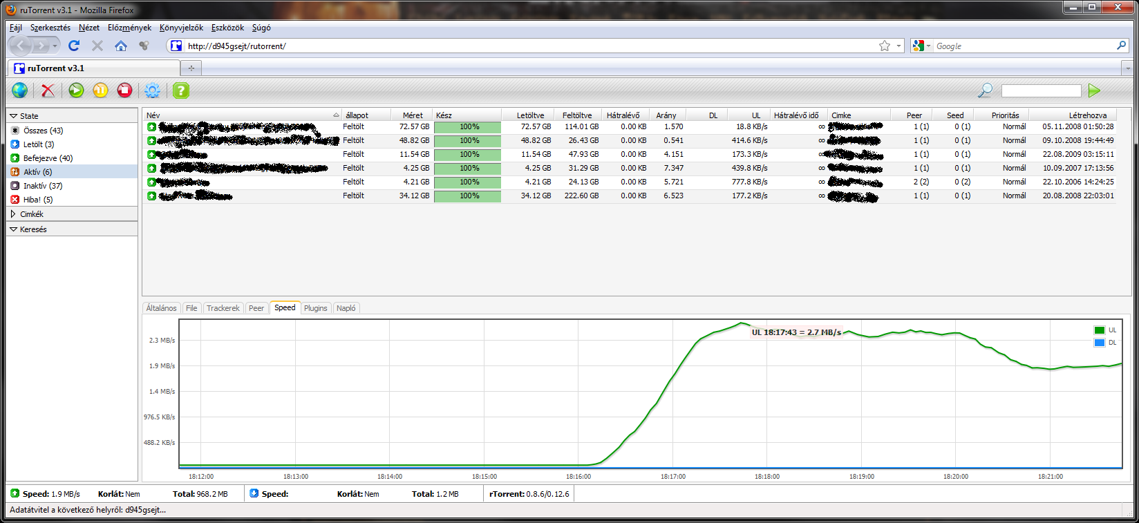 Probald ki Laca amikor hasit a torrent, de nem am 1 letoltes. Legalabb 2-3 user, mindegyik user 5-6 aktiv letoltessel,es kb.1000 kapcsolat engedelyezessel user-enkent.Persze legyen is ennyi aktiv seeder. Na,es most probalj meg sambazni.Ehhez szerintem keves mar az atom, de te kiprobalhatod.Nem lattam a cpu load plugin-t a bal also sarokban.Nem telepitetted fel?
