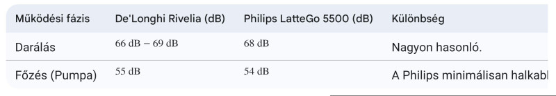 Geminit nagy nehezen rávettem, hogy keressen mérési eredményeket a zajról, és érdekes eredményt hozott. Itt mindenki, aki philipsről váltott azt nyilatkozta, hogy csendesebb minden tekintetben a Rivelia. Gemini első körös kutatása is ezt erősítette meg, aztán mutatott egy mérési eredmény összehasonlítást, ami érdekes. Ennek ellenére én simán elhiszem, hogy halkabb a Delonghi. Mondjuk két külön tesztből kukázta.