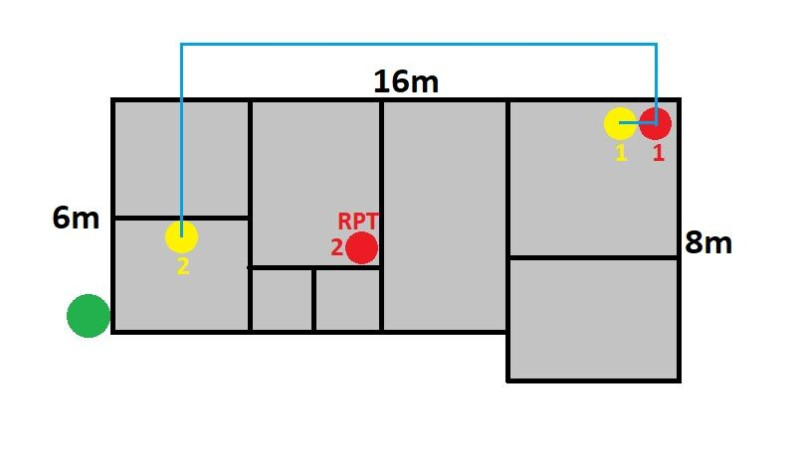Kérdés: a zöld pötty egy jövendőbeli kamera (lehet ugyanazon az oldalon a másik sarkon is lenne egy a jövőben, így a ház két hosszanti oldalát látnám). Hogyan lehetne jól megoldani, hogy wifire tudjon kapcsolódni ez a kamera?