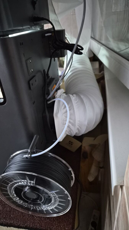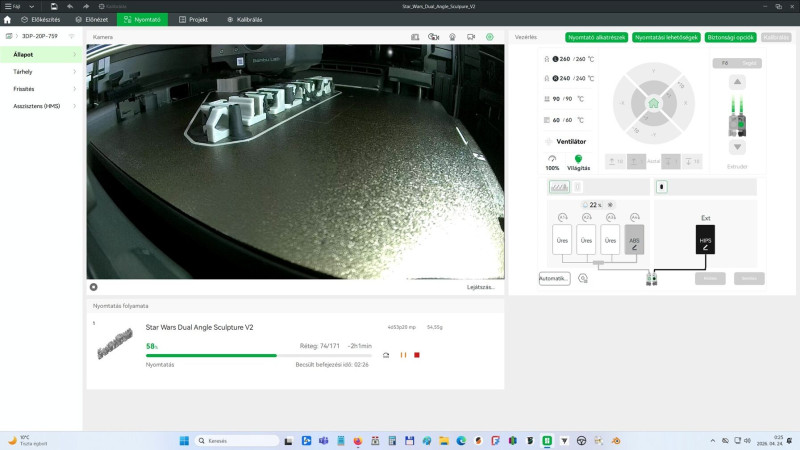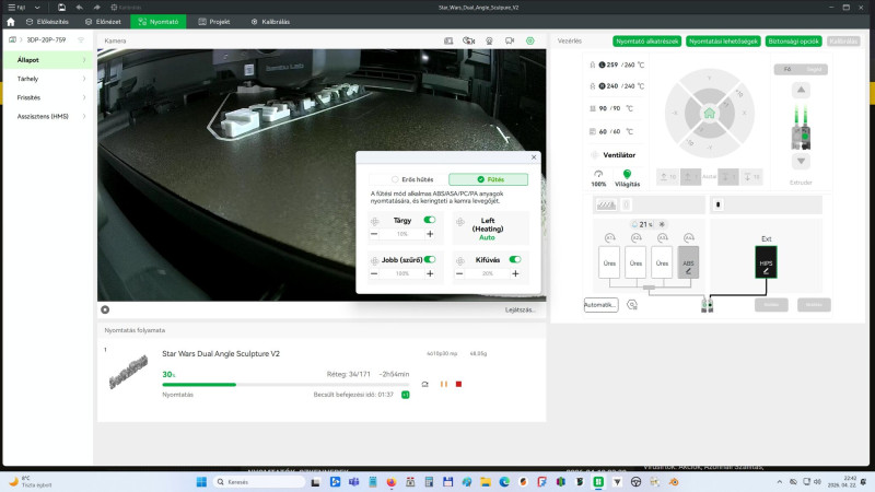 Megy a Star Warsos modell nyomtatása. A képeken látszik hogy a modell ABS a support filament pedig HIPS. Eddig jónak tűnik. Jelenleg a káros anyag elszívás megy 20%-on az ablakon keresztül ki nektek is.