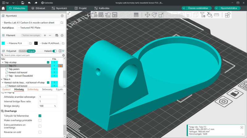A tárgy amint a slicer-ben látszik négy komponensből áll. A kerek talp 100% kitöltésű, a többi része a tárgynak 50%-os.