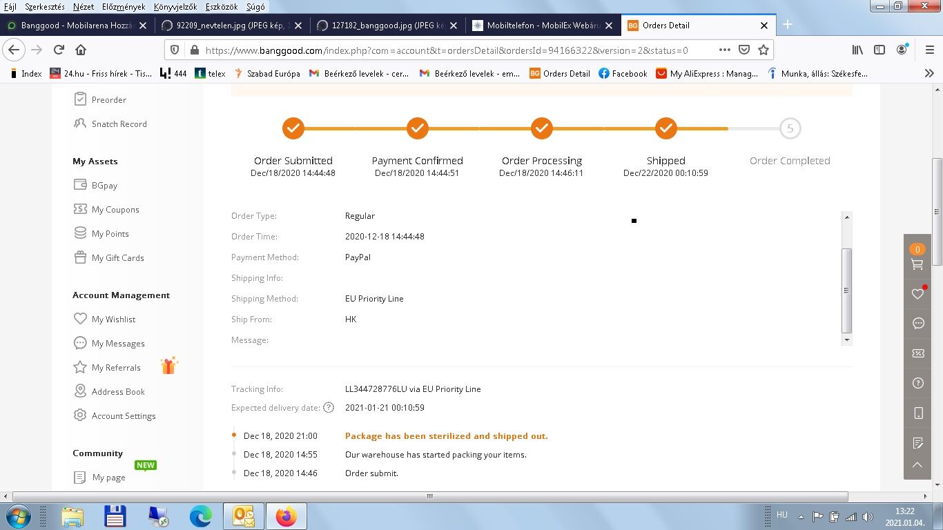 Miután törölték a múltkori megrendelésem és visszakaptam a pénzt Paypalra, tegnap este újra megrendeltem ugyanazt a terméket. Most már nem a kifogásolt BG Express szállítással, hanem a 6 euróval drágább EU Priority Line módot válaszottam.