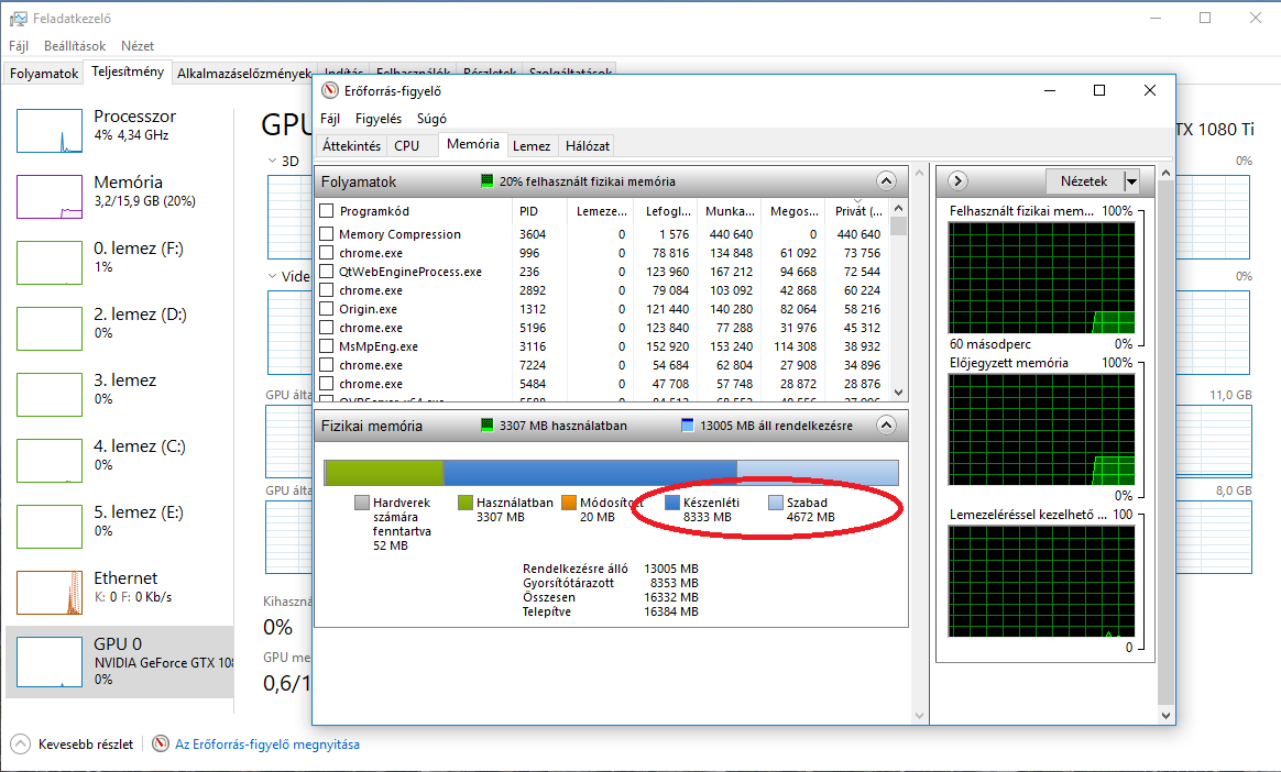 Nem futok ki, hanem a készenléti memória, ami igazából szabad memóriának számít vagy inkább újrafelhasználhatónak, az elfogyasztja a szabad memóriát. Konkrétan amikor megnyitsz egy fájlt, annak a tartalma a készenléti memóriába kerül, mondván hátha kell még. Ha mégsem kell később, akkor egyszerűen felülírja egy másik. A windows bug miatt ez valamiért lassú és ilyenkor beszaggatnak a játékok. Amúgy a sima netezés is szépen megeszi a szabad memóriát és csak készenléti marad. Ez alapesetben semmilyen következménnyel nem járna.