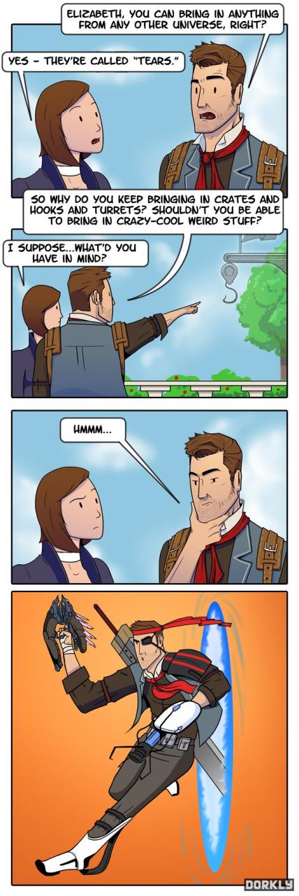 Szóval: Elizabeth elsődleges feladata innentől, hogy a katasztrófát Columbiával megakadályozza. Az Infinite vége ehhez a megoldáshoz kikövezi az utat, mutatja hogy mi fog történni. Ehhez képest, a két DLC-ben Elizabeth jelenléte pont azt mutatja, hogy nem ezt csinálja. Hiszen ha csinálná, szerintem már el is kellett volna pusztulnia. (ha Comstockot tényleg megölnik az adott múltbéli ponton, ahogy az Infinite propagálja, akkor az egész első DLC a Rapture-be menekülő Comstockkal meg sem történetne...)
