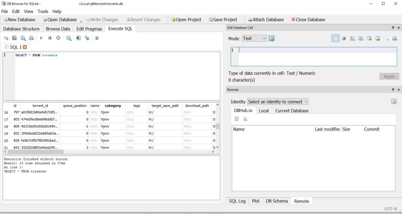 File menü - open file - betallózod a db fájlt,(előtte ugye mentetted!!!) majd SQL Editor menü - open sql script. Beírod, hogy SELECT * FROM torrents, majd a mellette lévő kis háromszögre (nyíl) kattintasz. Megjelenik a táblázat amit fentebb is látható, Megkeresed a target_save_path oszlopban a letöltés helyét és módosítod amire szeretnéd. Utána alul save gomb. Majd mented torrents.db néven a kliens mappájába. Kliens elindít, és úgy látom, hogy át is rakta a letöltött fájlt az új helyére.