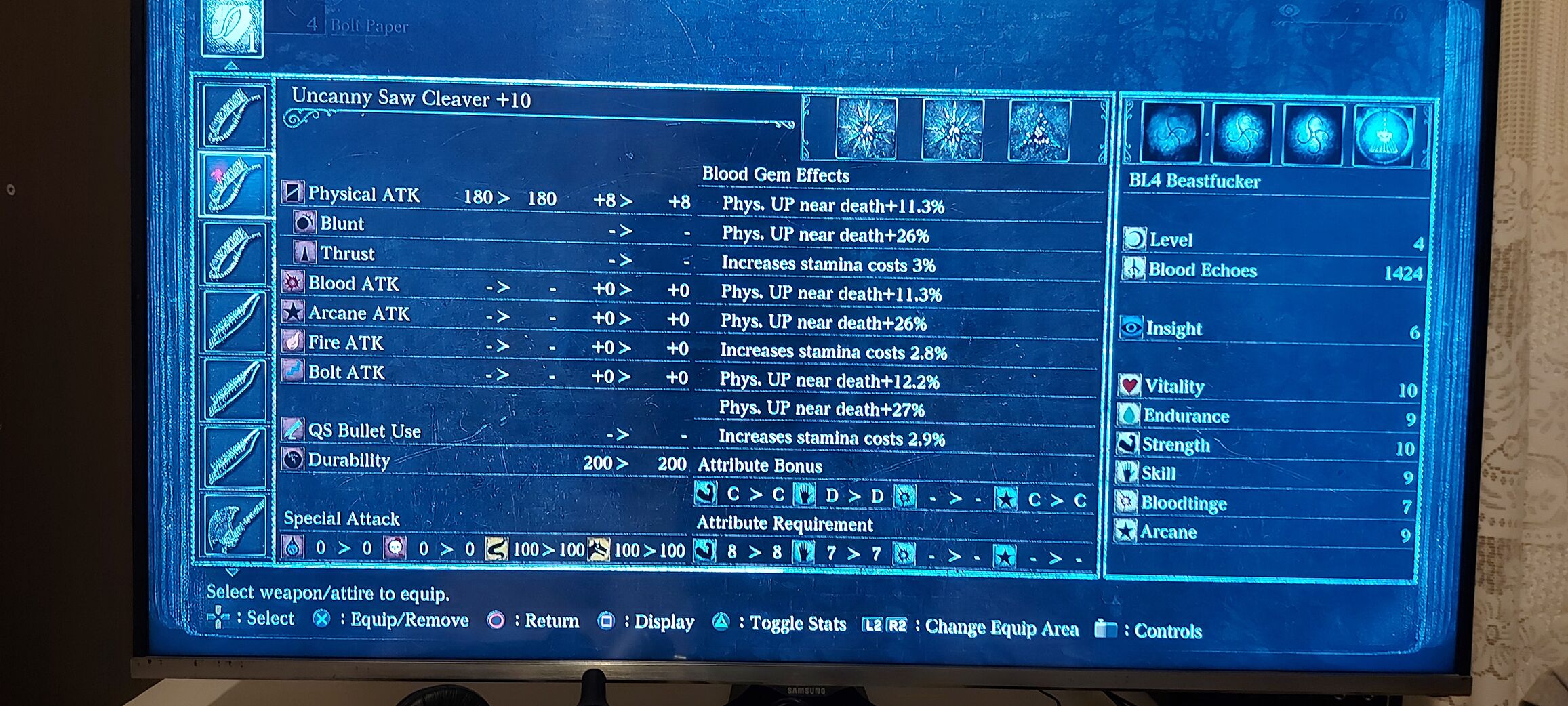 Hát mondhatni, hogy a skill a dex, gondolom nézted, hogy a fegyver, amivel mész, az mire skálázódik. Ennek megfelelően kell. Mondjuk nincs equip load, poise stat sincs, szóval lehet egy "árkád" souls-nak nevezni a BB-t, bár van aki szerint ez nem souls, de még csak nem is souls-like.