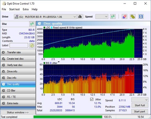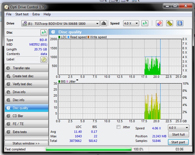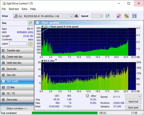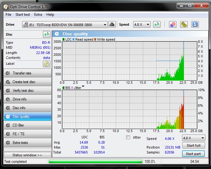 Rögtön elő is vettem egy pár évvel régebben megírt DL lemezt, ami Verbatim márkájú, MEI-T02-001 médiakódos. Az első rétegnél semmi szokatlan, kb. 8x olvasási sebesség, a második rétegnél is 7-8x között mozgott.