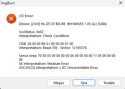 Az írás gond nélkül végigment azonban az ellenőrzésbe belefagyott az imgburn, mikor a tálca kitolását akarta csinálni.