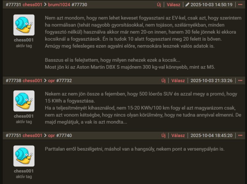 Igen, azért is nem érdemes ebbe belemenni, hogy mennyi a fogyasztás, mert mindenkinek más. Más a stílusa, más az útvonal. Ha lehet neki nyomni és úgy is elmegy 400 kmt az szerintem tök jó érték. Nagy az aksi, jó a fogyasztás-ár, szerintem nagyon rendben van a kocsi amúgy...