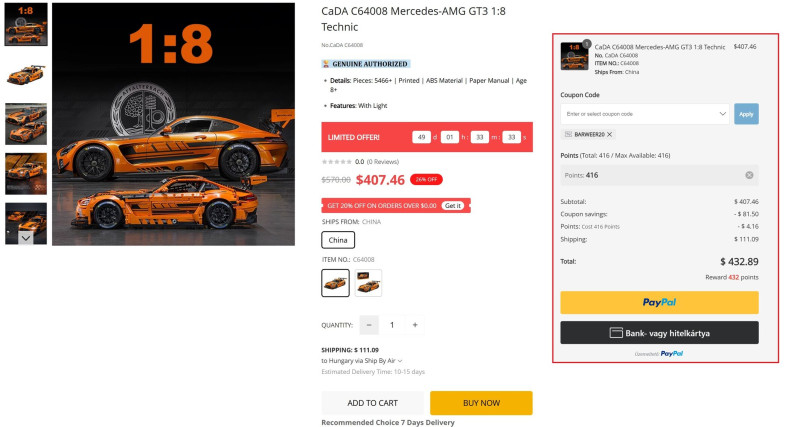 Egyelőre lemondtam a Mercedes-AMG GT3 készletről. Persze mindenképp megveszem majd valamikor, de előbb elkezdek rá gyűjteni, és majd jövőre talán lesz rá a Barweer oldalán akció. Ha a 20% kupon addigra nem is marad meg, de van egy 15% kuponom is, ami 2099-ig érvényes...