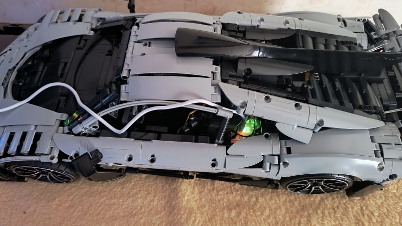 Tegnap a Mercedes AMG ONE akkumulátorát is feltöltöttem, majd megjárattam kicsit a motorokat, mivel amióta összeépítettem, még nem volt bekapcsolva. Kézben tartva forgattam a kerekeket, mivel nem akarom, hogy a gumik összeszedjenek mindenféle koszt a padlóról. Nyitogattam az ajtókat, forgattam a kormányt, és a KERS-motort is felhúztam párszor. Sok értelme nincs, de szeretek néha kicsit bohóckodni vele.