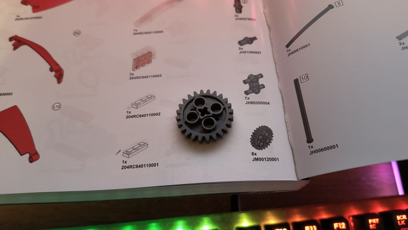 Viszont, nem sokkal a második fázis vége előtt belefutottam egy eléggé súlyos problémába, nevezetesen hiányzott egy elem a készletből. Egy 24-fogas szürke fogaskerék, elvileg hat darabnak kellett volna benne lennie, de én csak ötöt találtam. Végignéztem mindent, még a bontatlan zacsikat is, nem-e került bele véletlenül egy másik zacskóba, még az üreseket is átnéztem, de semmi.